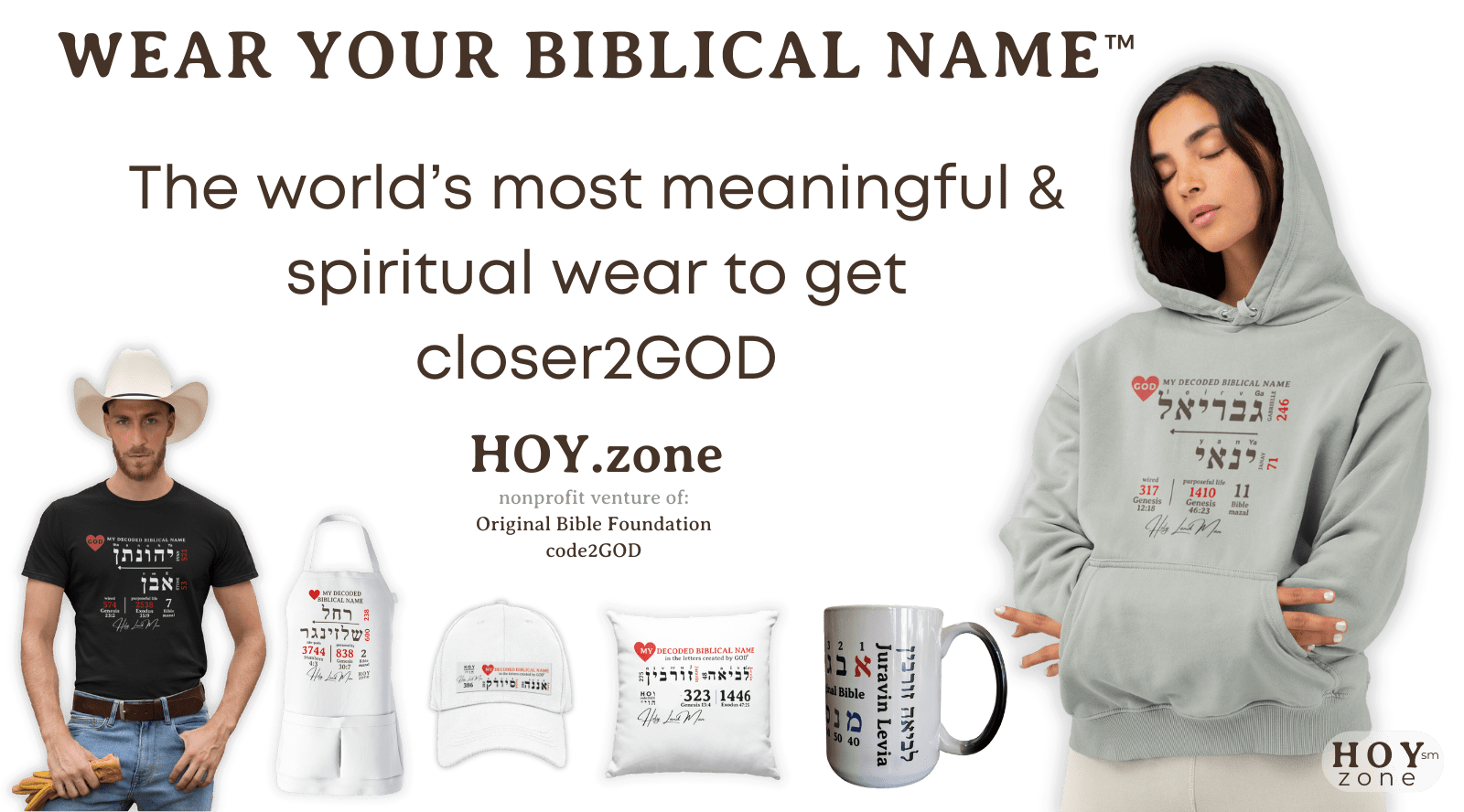 Uncover your Biblical name in God’s holy letters ⦿ Explore the code within your name ⦿ Explore your life’s path hidden in your original Bible verse ⦿ Embrace your Biblical name through meaningful HOY wear ⦿ Adopt “LOVING GOD WITHOUT RELIGION” ⦿ Discover your purposeful life ⦿ Witness celebrities tattooing God’s letters (details below) ⦿ Empower yourself with HOY for a purposeful life